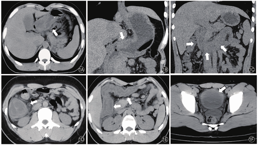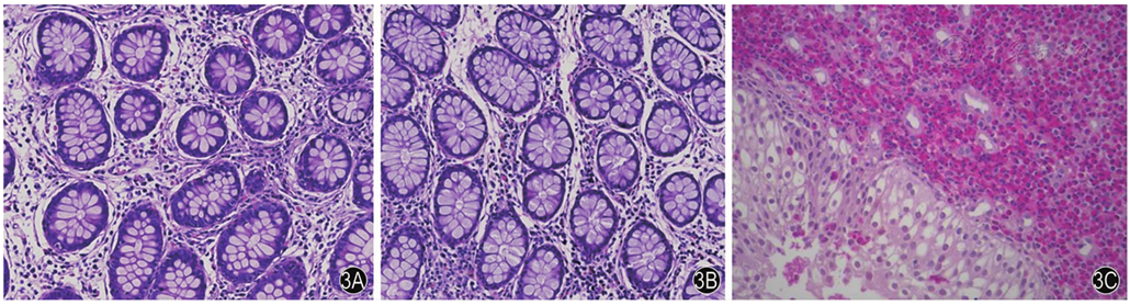 患者男性,15岁,因腹痛伴呕吐10余天,加重1天于2021年7月9日入院。既往"阑尾炎"病史1年余,药物保守治疗。患者于2021年6月21日无明显诱因出现腹痛伴呕吐,腹痛为右侧腹部阵发性绞痛,无其他部位放射,与进食排便无相关,伴频繁恶心、呕吐,非喷射性,呕吐物为所进食物,混有宿食,酸臭明显,伴腹泻,每日排黄色稀水样便6~8次,无鲜血及脓液,于当地诊所按"阑尾炎、胃肠炎"输液治疗数天,症状无好转,逐于2021年7月1日就诊于我院急诊。血液分析:白细胞10.45×109/L(正常值3.5~9.5×109/L),中性粒细胞6×109/L,淋巴细胞2.35×109/L,单核细胞0.71×109/L,嗜碱性粒细胞0.06×109/L,嗜酸性粒细胞计数1.33×109/L(正常值0.02~0.52×109/L),嗜酸性粒细胞百分比12.7%(正常值0.4~8.0%),红细胞计数5.19×109/L,血小板计数305×109/L,血红蛋白141 g/L,C反应蛋白3.05 mg/L,红细胞沉降率2 mm/1 h。生化全项:尿酸472 μmol/L(正常值208~506 μmol/L),余无异常。同日CT检查:胃窦、十二指肠、空肠近段、回肠末段、升结肠及右半横结肠肠壁增厚、水肿,呈分层样表现(图1A~1E),腹腔少量积液,并见膀胱壁弥漫性增厚(图1F)。连续7天予以输注头孢曲松及止痛药等治疗,腹痛稍缓解,仍有间断恶心、呕吐,每日排黄色稍成形便2~3次。1天前患者进食海鲜后出现剧烈腹痛,为持续性钝痛,恶心、呕吐较前频繁,同时出现尿频、尿急等尿路刺激症状,尿液蛋黄色,沫稍多,为求诊治,于2021年7月9日以"腹痛"收入我院消化科。血液分析:白细胞17.58×109/L,其中嗜酸性粒细胞计数6.23×109/L,嗜酸性粒细胞百分比35.4%,中性粒细胞7.82×109/L。生化全项:尿酸533 μmol/L,IgE 1427 IU/mL(正常值1.31~165.3 IU/mL)。尿液及沉渣分析:尿液呈淡黄色,轻度浑浊,尿微量白蛋白0.15 g/L。2021年7月9日CT检查:胃窦、十二指肠大致同前,空肠、回肠、升结肠及横结肠肠壁增厚程度及范围较前进展,腹腔积液较前增多,右侧胸腔新发少量积液;膀胱壁增厚较前进展。2021年7月12日完善骨髓穿刺骨髓像:粒系增生活跃,原粒未见,中、晚粒、杆状核比值偏低,形态未见明显异常,可见33%嗜酸性粒细胞,提示嗜酸性粒细胞增多。2021年7月12日胃肠镜提示:胃窦、十二指肠、空肠近段、回肠末段、升结肠及横结肠黏膜明显肿胀,管腔狭窄,表面散在充血红肿、糜烂(图2)。病理回报:胃窦黏液型黏膜慢性炎(++),活动性(+),少量嗜酸性粒细胞浸润,固有膜纤维组织增生;十二指肠降段,小肠绒毛萎缩,可见潘氏腺,固有层见嗜酸性粒细胞浸润;结肠黏膜组织,固有层较多嗜酸性粒细胞浸润,提示嗜酸细胞性胃肠炎(图3)。膀胱镜及病理结果:镜下膀胱黏膜弥漫性充血、水肿,病理组织学检查示黏膜层见大量嗜酸性粒细胞浸润,并混有少许淋巴细胞、浆细胞。过敏源检测对鸡肉、鸡蛋、蘑菇、小麦、鳕鱼等呈阳性。结合组织学检查诊断为嗜酸细胞性胃肠炎合并膀胱炎。给予泼尼松40 mg,qd,晨起顿服2周,然后每周减5 mg至停药,余继续予以抑酸、补液、调节肠道菌群及营养支持治疗,嘱患者暂避免进食大豆、小麦、蛋、奶、花生、坚果及鱼类等食物。