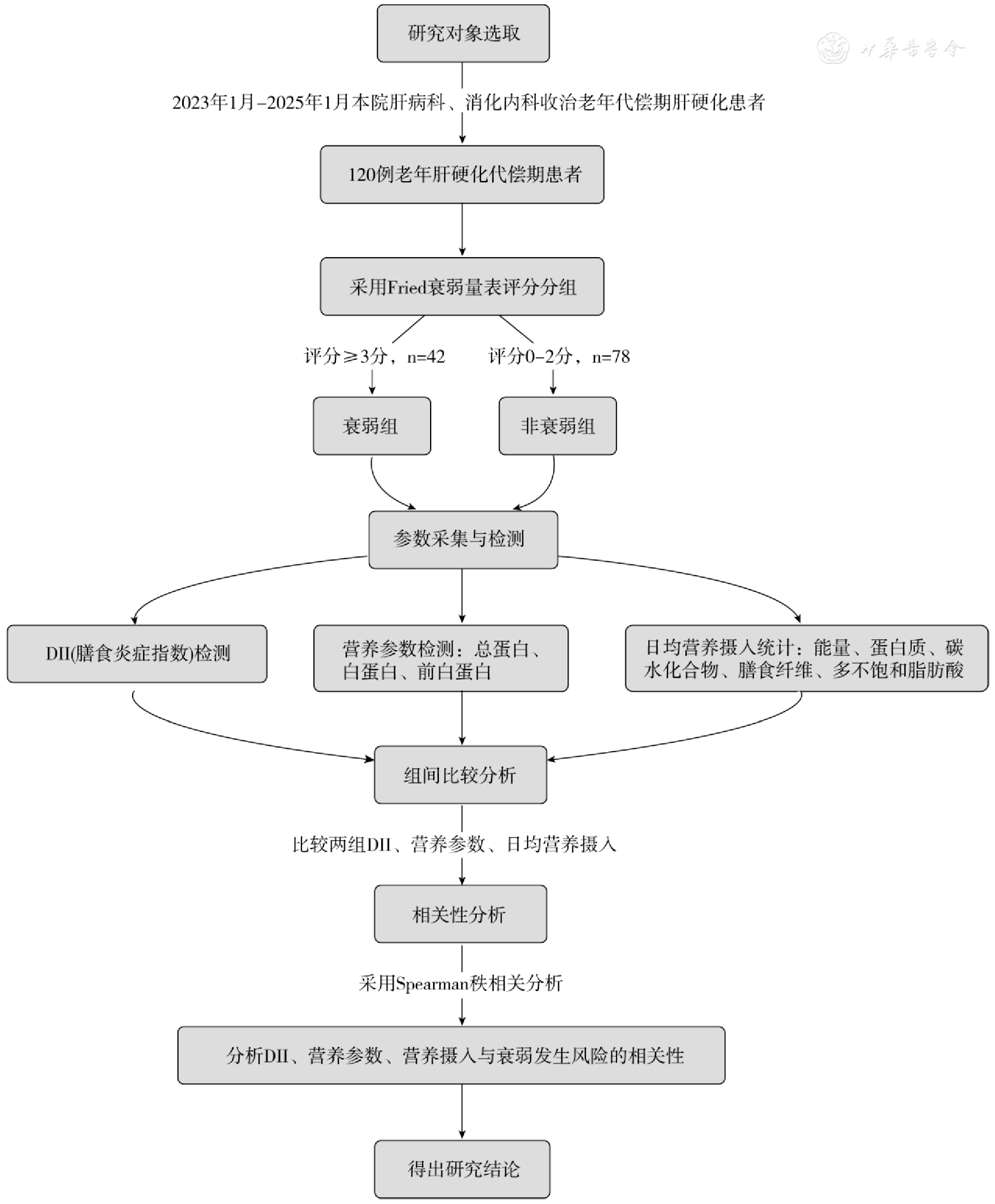 To explore the correlation between dietary inflammation index (DII), nutritional parameters and the risk of frailty in elderly patients with compensated liver cirrhosis, and to provide a reference for early clinical intervention.